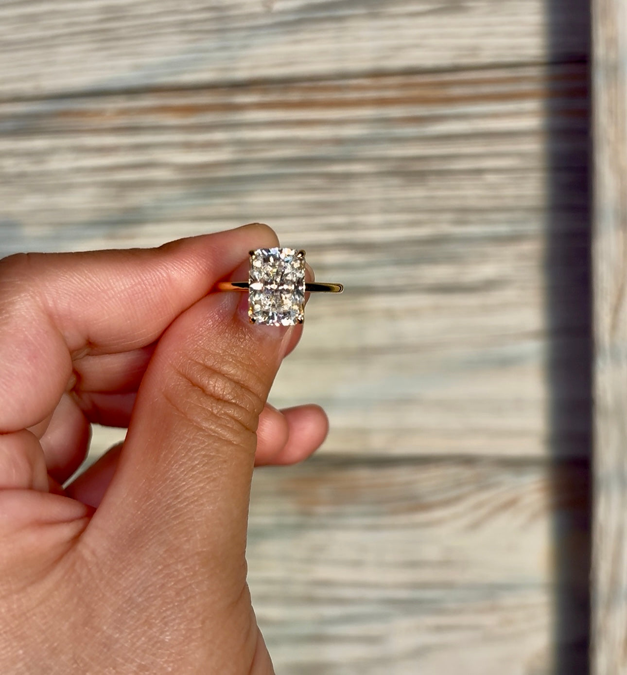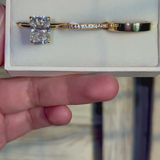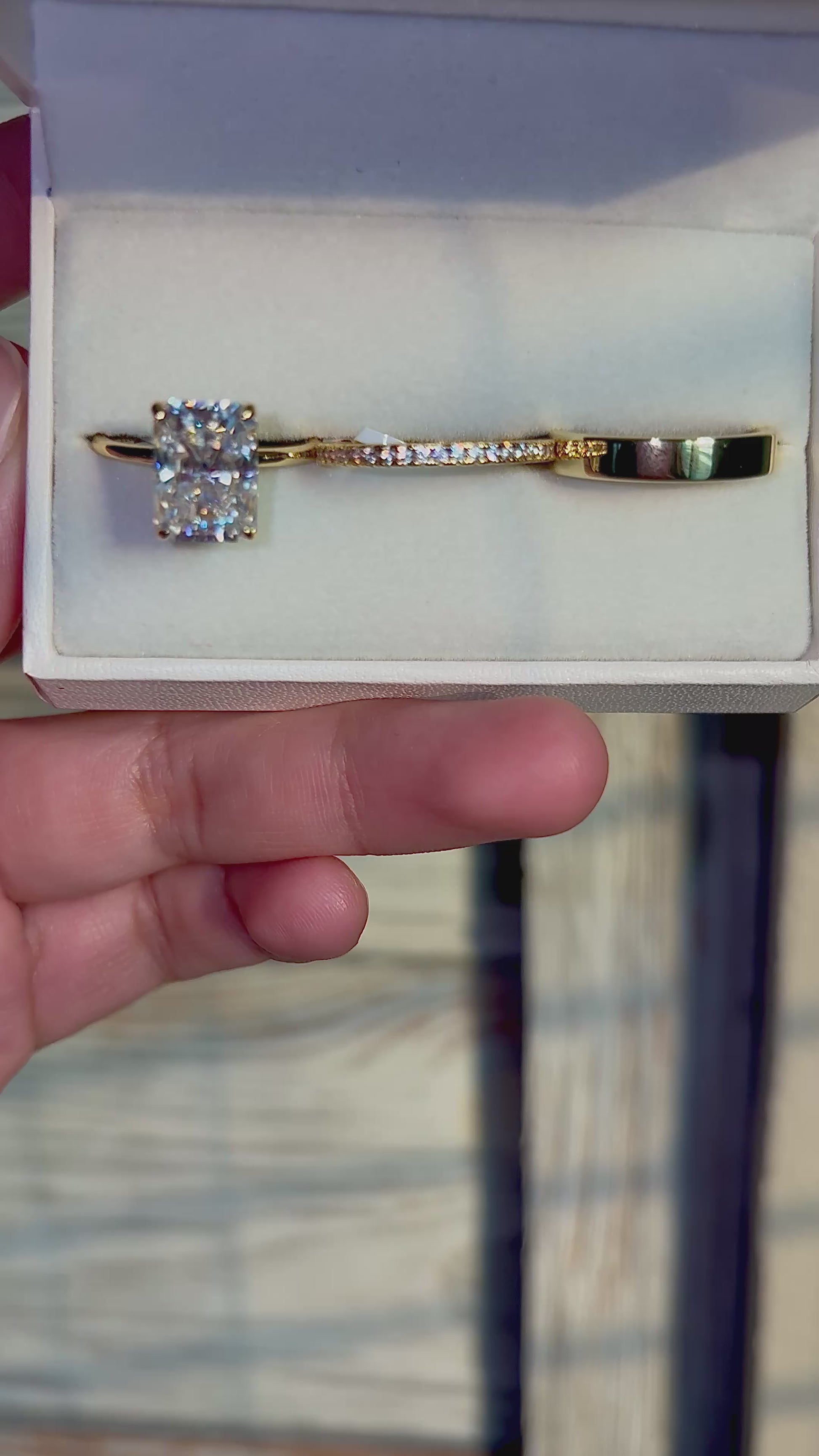 A perfect radiant cut engagement ring along with a pave band and its wedding ring. This set is the perfect alternative for someone who does not want to spend thousands on a diamond. It is a moissanite, comes with its GRA certification. The brilliance and shine of this ring is impeccable, will not be disappointed!